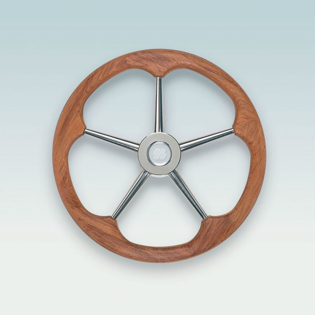 Jahdin ohjauspyörä luonnollista tiikkiä. Kartioreiän standardikoko 3/4’’, urakkanupilla, halkaisija 400 mm.