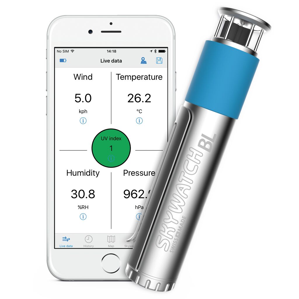 Skywatch BL500 on täydellinen sääasema, joka liitetään älypuhelimeen langattoman Bluetooth-liitännän avulla. Sen avulla voi mitata tarkasti tuulennopeutta, lämpötilaa, ilmankosteutta, ilmanpainetta ja UV-indeksiä. Mittaustulokset on mahdollista jakaa suosituilla sosiaalisen median sivustoilla.<br /><br />Skywatch BL500 on suunniteltu erityisesti erilaisiin ulkoilutilanteisiin kuten purjehdukseen, leijasurffaukseen, laskuvarjoliitelyyn, retkeilyyn jne. Lisäksi se on kätevä apuväline maanviljelyssä ja rakennuskohteissa jne.<br /><br />• Tuulennopeus – tuulen suunta<br />• Lämpötila – tuulen hyytävyys, lämpöindeksi<br />• Ilmankosteus – kastepiste<br />• Ilmanpaine– korkeus merenpinnasta – QNH<br />• UV-indeksi<br />Mitatut tiedot on mahdollista tallentaa ja jakaa Facebookissa, Twitterissä tai Instagramissa.<br />Käyttöohje ja YKK-kysymykset ja vastaukset ovat saatavissa Internet-sivuilla osoitteessa bl.skywatch.ch/support.<br /><br /><br />TEKNISET TIEDOT<br /><br />Tuulennopeus<br />• Yksiköt: km/h, m/s, mph, fps, solmua ja Boforia<br />• Erotuskyky: 0.1<br />• Tarkkuus: ± 3% / ±0.5 km/h<br />• Mittausalue: 3 ... 150 km/h<br /><br />Lämpötila<br />• Yksiköt: °C ja °F<br />• Erotuskyky: 0.1<br />• Tarkkuus: ± 0.3 °C<br />• Mittausalue: -25 ... +60 °C<br /><br />Ilmankosteus<br />• Yksiköt: %HR<br />• Erotuskyky: 0.1<br />• Tarkkuus: ± 3 %HR (10-90 %HR)<br />• Mittausalue: 0 ... 100 %HR<br /><br />Ilmanpaine<br />• Yksiköt: hPa, mbar ja inHg<br />• Erotuskyky: 0.1 unit<br />• Tarkkuus: ± 0.2 hPa<br />• Mittausalue: 300 ... 1200 hPa<br /><br />UV-indeksi<br />• Yksiköt: UV<br />• Erotuskyky: 1<br />• Tarkkuus: ± 1<br />• Mittausalue: 0 ... 15<br /><br />TOIMINNOT<br />• Välittömästi näytössä näkyvät mittaustulokset<br />• Graafinen näyttö jossa hetkellinen arvo, minimi- ja maksimiarvot, keskiarvo ja muut arvot<br />• Seurantatila joka tallentaa mittaustulokset ja GPS-koordinaatit automaattisesti<br />• Mittaustietojen jakomahdollisuus: Facebook, Twitter, Instagram <br />• Historiatiedot<br />• Kaikkien mittauksien näyttö kartalla<br /><br />APP-SOVELLUKSET<br />• Android 4.4 tai uudempi<br />• iOS 8.4 tai uudempi<br />• Yhteensopiva Bluetooth v4.0:n tai uudempien kanssa. Käyttää vakiotyyppisiä profiileja: Environmental Sensing Profile (ESP) ja Service Environmental Sensing (ESS)<br />• Valikkokielet: Englanti, Ranska<br />• Laitteen ohjelmisto saatavissa Internetin kautta <br /><br />MUITA OMINAISUUKSIA<br />• Kääntyvä mittausanturi tuulennopeudelle<br />• Anturit vedettävissä esiin suoja-asennosta<br />• Herkkäliikkeiset liikeanturit<br />• Bluetooth-liitännän ja akkujännitteen tason ilmaisu LED-merkkivaloilla<br />• Virtalähde: ladattava akku, lataus microUSB-kaapelin avulla, latauksen merkkivalo<br />• Mitat: halkaisija 26 x 116 mm (suljettu, ei klipsiä)<br />• Materiaali: eloksoitu alumiini<br />• Paino: 66 g (ei klipsiä)<br />• Suojausluokka: IP67<br />• Käyttölämpötila: -20 ... +50 °C<br />• Akun toiminta-aika: yli viikko<br />• Virallinen kalibrointi (Sveitsi)