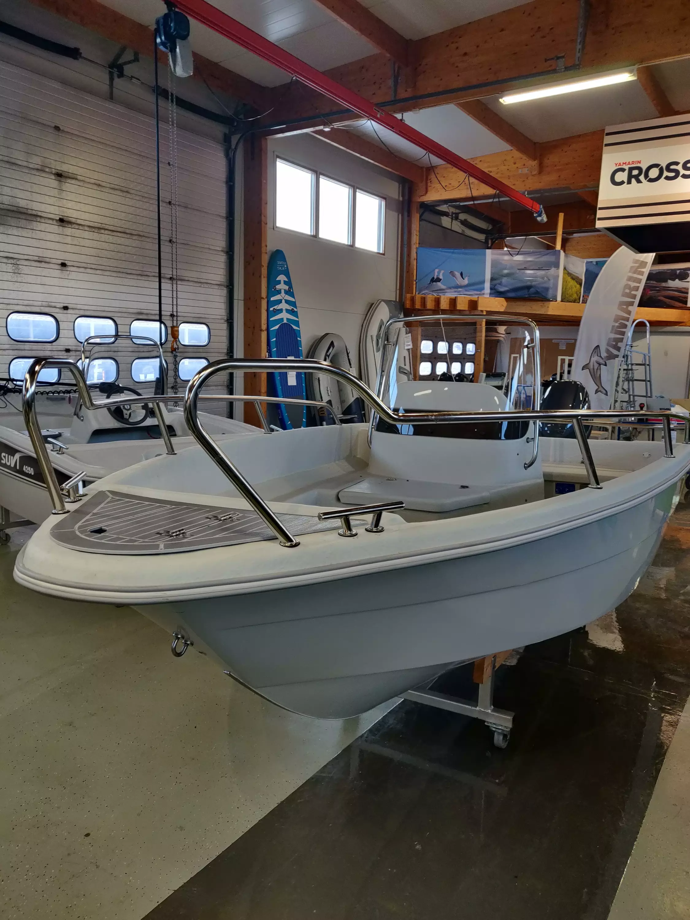 Tässä moottoriveneessä on vakiona kaiteet, tuulilasi ja uimaportaat.