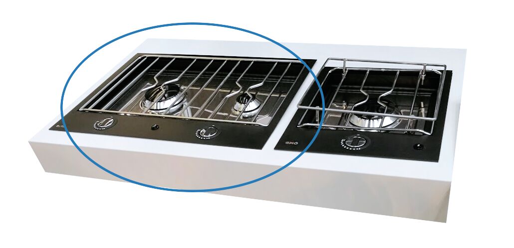 2-liekkinen keitin uppoasennukseen. Liesiosa ruostumatonta terästä ja liesirunko mustaksi eloksoitua alumiinia. Upotussyvyys 110 mm. Liesi nousee ainoastaan 2 mm tasoa korkeammalle. Lieden pintaan upotetut säätönupit. Liedessä on paristoilla toimiva sähkösytytys. Helposti irrotettava ritilä puhdistusta varten. Tehokkaat polttimot, joissa polttimonkansi lukkiutuu paikoilleen. Mitat 570 x 422 mm. Letkuyhde G1/4-kaasukierre.