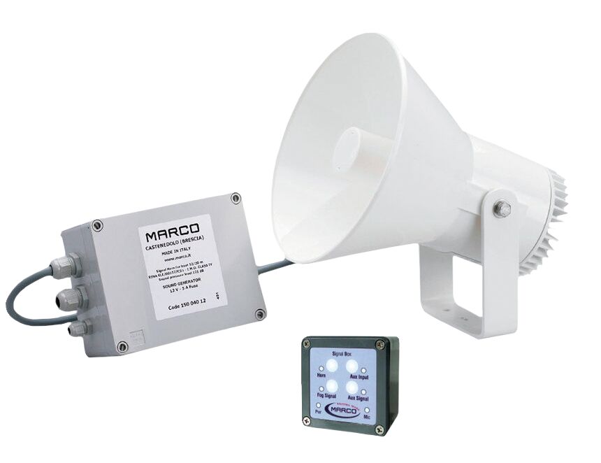 EW2 ÄÄNITORVI 12/20M + SUMUSIGNAALI Hyväksytty äänitorvi, jota täydentävät kaiutin, sisäänrakennettu kalvo-ohjauspaneeli ja elektroninen ohjain. Uusi ultraäänilämmitysjärjestelmä tarjoaa paremman akustisen kalvon suorituskyvyn. Täyttää COLREG 1972 IMO luokan IV kansainväliset määräykset ja on luokitusten RINA, LLOYD'S REGISTER MCA, BUREAU VERITAS, NMMA ja BSH mukainen. Sisältää asennustarvikkeet.