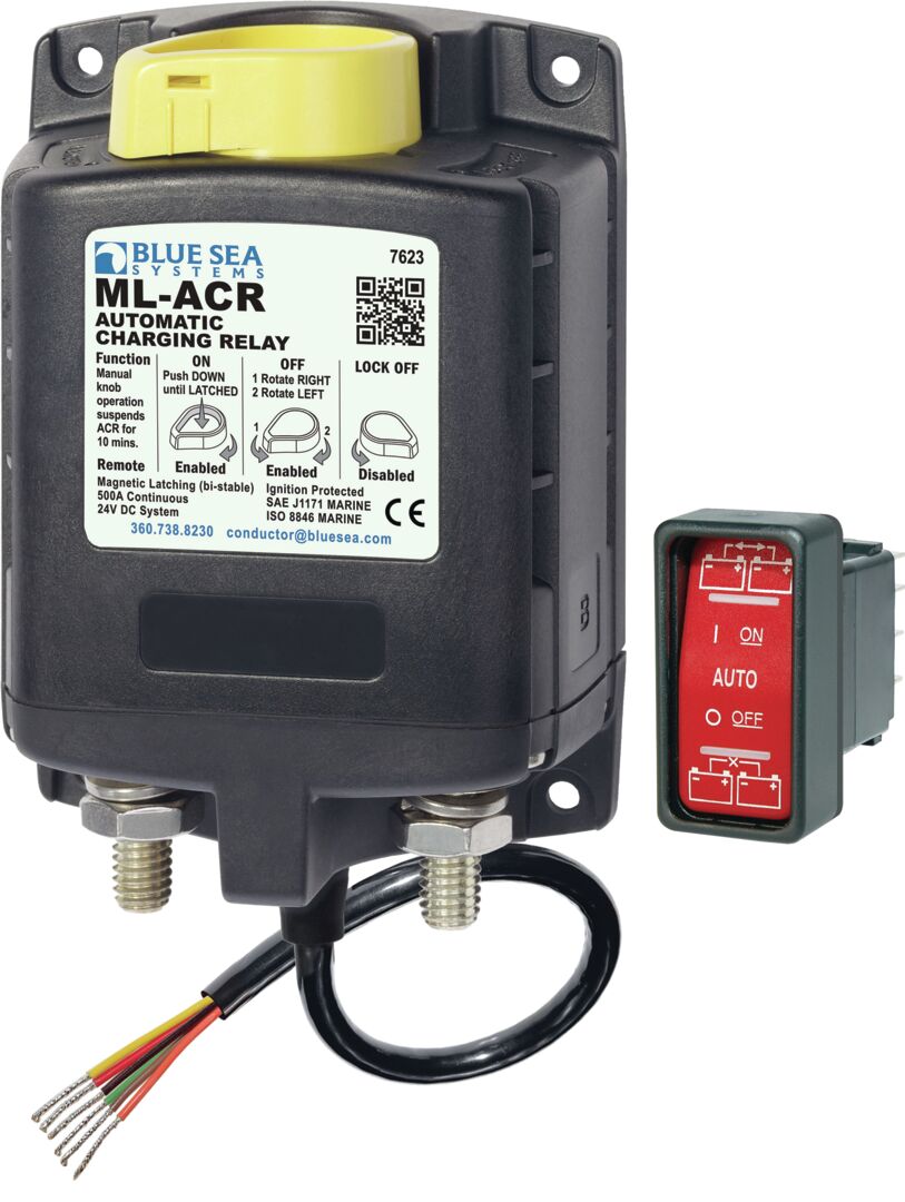 ML-ACR sarjan latausrele (magnet latch). Latausvirtojen ohjaus tapahtuu solenoidi periaatteella.<br />Releen ohjaus tapahtuu etänä, erillisellä mukana seuraavalla sähköisellä<br />käyttökytkimellä. Releen 7622 ja 7623 päädyssä on manuaalinen ohjauskytkin vikatilanteiden<br />varalta. Rele voidaan ohjelmoida niin että rele ei yhdistä akustoja käynnistyksen<br />aikana. Releestä saadaan ulos LED signaali josta voidaan tuoda tieto releen statuksesta.<br />Koteloiden koot: l.95 x k.139 x s.52 mm<br />Kuormitukset: jatkuva/ hetkittäin (5min)/ hajoamiskuorma (1min)/ hajoamiskuorma (10sec).