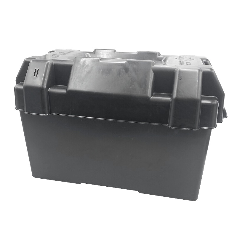 Muovinen akkukotelo, varustettu hihnalla. Iso: 20 x 41 x 20 cm, keltainen.