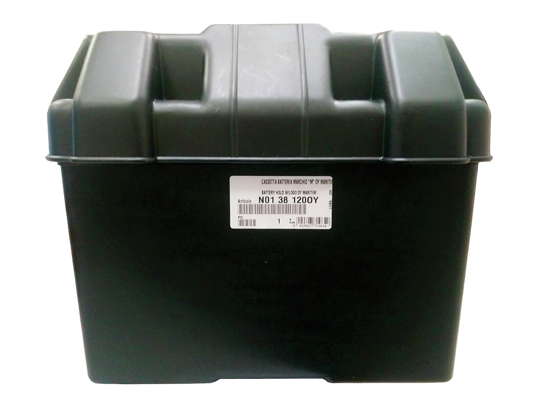 Muovinen akkukotelo, varustettu hihnalla. Vakio: 19 x 27 x 20 cm.