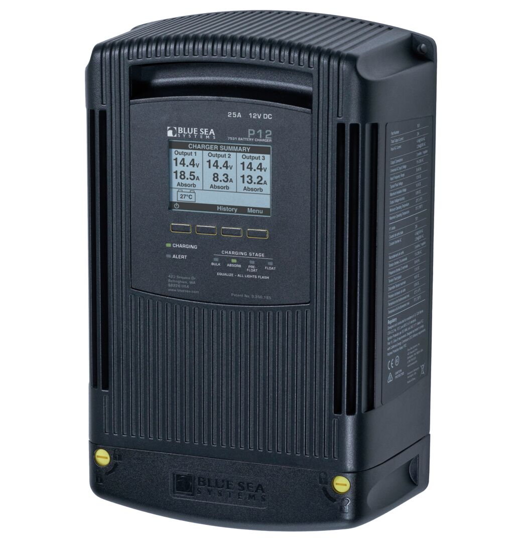 Akkulaturissa 4-vaiheinen latausprosessi ja kolme lähtöä. Asennus kuivaan tilaan, soveltuu käytettäväksi vaativimmissakin ympäristöissä. • Kestävä siivekkeinen alumiinikotelo • PreFloat™-latausvaihe estä ylilatauksen • Tehokerroinkorjaus tehostaa AC-käyttöä • Intuitiivinen diagnostiikkanäyttö • Käyttäjän valittavissa olevat latausprofiilit ja muokattavat asetukset • Mahdollistaa jopa kolmen akun lataamisen • Kookas kirkas näyttö • Monikielinen valikko: Englanti, Ranska, Saksa, Italia, Espanja • Latauksen koordinointi Blue Sea Systems -yhtiön Automatic Charging Relays (ACR) -säätimien kanssa, ACR varmistaa kullekin akulle sopivan kellutuslatauksen • Akkulämpötilaan perustuva kompensointi - säätää latausjännitteen akkulämpötilaan perustuen • AC yli- ja alijännitetilat aiheuttavat sammutuksen ja automaattisen uudelleenkäynnistyksen • Akun yli- ja alilämpötilan suojaus – lataustoiminto ei käynnisty, mikäli akun lämpötila nousee tai laskee asetusarvojen ohi • DC-ylijännite- ja väärän napaisuuden suojaustoiminnot • Syöksyvirta- ja oikosulkusuojaustoiminnot