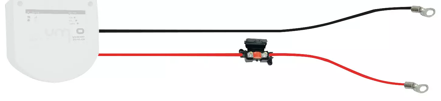Tekniset tiedot:<br />• Liitäntä: Aurinkolataussäädin > Akku<br />• Kaapelit: Musta + Punainen<br />• Kaapelin poikkipinta-ala: 6 mm² / Pituus: 2 m<br />• Akkuliittimet: Ø 8 mm (2 kpl)<br />• Sisältää sulakkeen suojaussarjan<br />• Yhteensopiva UNIMPPT 30/10.12S - 60/15.24S - 60/15.24 - 60/20.24S -mallien kanssa