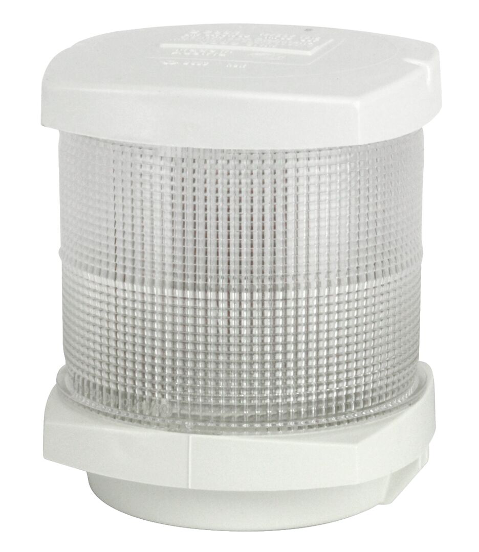 Ankkurivalo 360°, valkoinen makrolonkuori. Alukset alle 20 metriä. SOLAS tyyppihyväksyntä NK-todistuksella. Lampunkanta BAY 15 d.