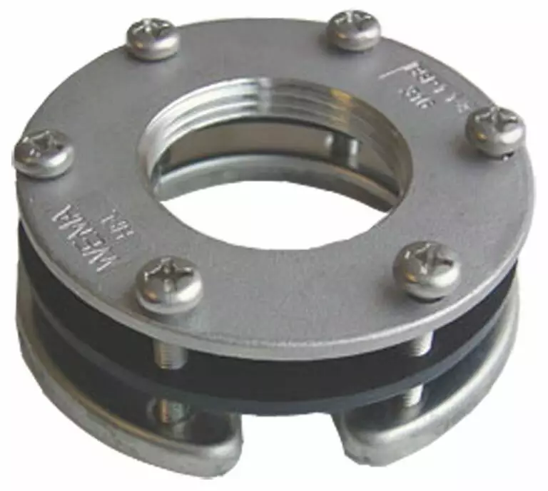 Ruostumaton asennuslaippa S3 anturille, Ø 80 mm. Kuudella ruuvireiällä, joiden jako-Ø 70 mm. Sisältää tiivisteet, ruuvit ja tankin sisäpuolisen tukilaipan.