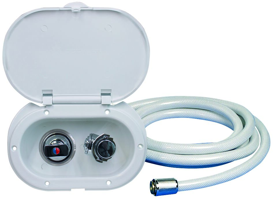 Kromattu/valkoinen muovikotelo, upotusmitat 150x80 mm, syvyys 40 mm. 2 -tehohana, suihkuletkunpituus 2,5 metriö
