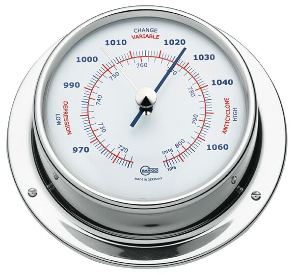 Barigo Sky -ilmapuntari kiillotettua ruostumatonta terästä. Valkoisella taustalla. Näytön halkaisija 85 mm. Ulkomitta 110 x 32 mm.
