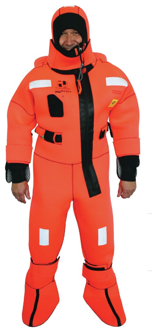 Hansen Protection Sea Eco SOLAS -pelastautumispuku. Yhdenkoon ns. 6 tunnin pelastautumispuku 150 - 200 cm pituiselle henkilölle. Ammattikäyttöön, IMO/SOLAS ja MED/EU-laivavarustedirektiivin mukainen ja hyväksytty. Tulta ylläpitämätön laadukas 5 mm:n neopreeni ja kulutusta kestävä oranssi nylonpinnoite sekä vahvistetut saumat. Vedenpitävät joustavat mansetit ja hupussa naaman pehmeät tiivisteet pitävät vedessä henkilön kuivana. Lämpimät käsineet ovat joustavalla hihnalla kiinni hihansuussa, ja nilkoissa istuvuutta parantavat kiristettävät tarranauhat. Pukua tulee aina käyttää pelastusliivin kanssa (myydään erikseen).