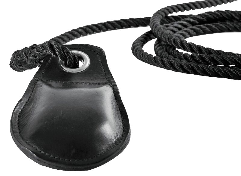 Heittopaino mustalla nahkapäällyksellä. Nikkelipinnoitettu messinkisilmukka.