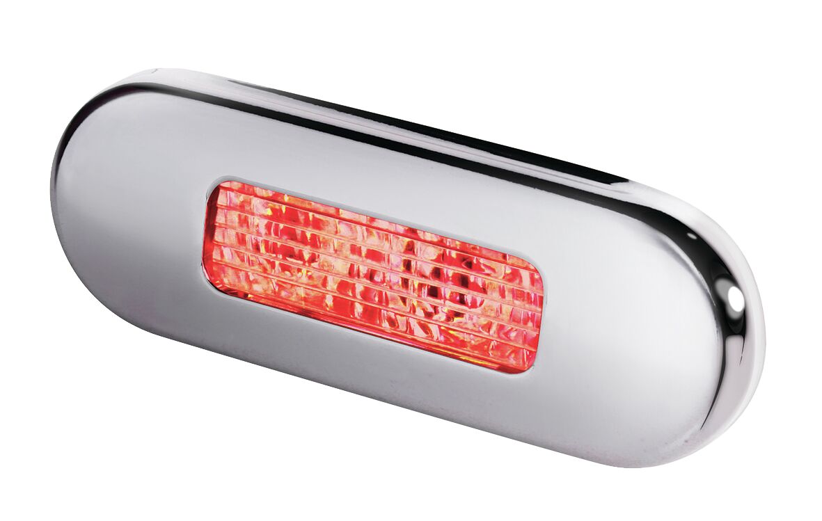 Hella askelmavalo, punainen LED, kiillotettu RST-kehys. Tyylikkäät ja kompaktit virtaa säästävät Hella Marine LED -askelmavalot ovat ihanteelliset sekä sisä- että ulkoasennuksiin. Umpinainen rakenne, hyvä iskunkestävyys, 30° alaspäin suuntautuva valokeila sekä ruostumaton koristekehys.