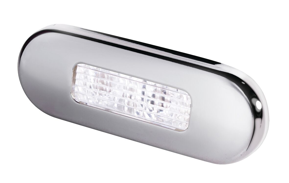 Hella askelmavalo, valkoinen LED, kiillotettu RST-kehys. Tyylikkäät ja kompaktit virtaa säästävät Hella Marine LED -askelmavalot ovat ihanteelliset sekä sisä- että ulkoasennuksiin. Umpinainen rakenne, hyvä iskunkestävyys, 30° alaspäin suuntautuva valokeila sekä ruostumaton koristekehys.