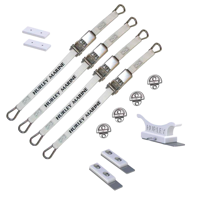 4-pisteen kiinnityspaketti sisältää:<br />• 4 kiristysnauhaa, osat ruostumatonta terästä<br />• 4 metallista kiinnityslenkkiä<br />• Kiinnityslenkkien taustalevyt <br />• Kiinnityshelojen suojat<br />• Sokkalukitteinen pollari köysien kiinnittämiseen