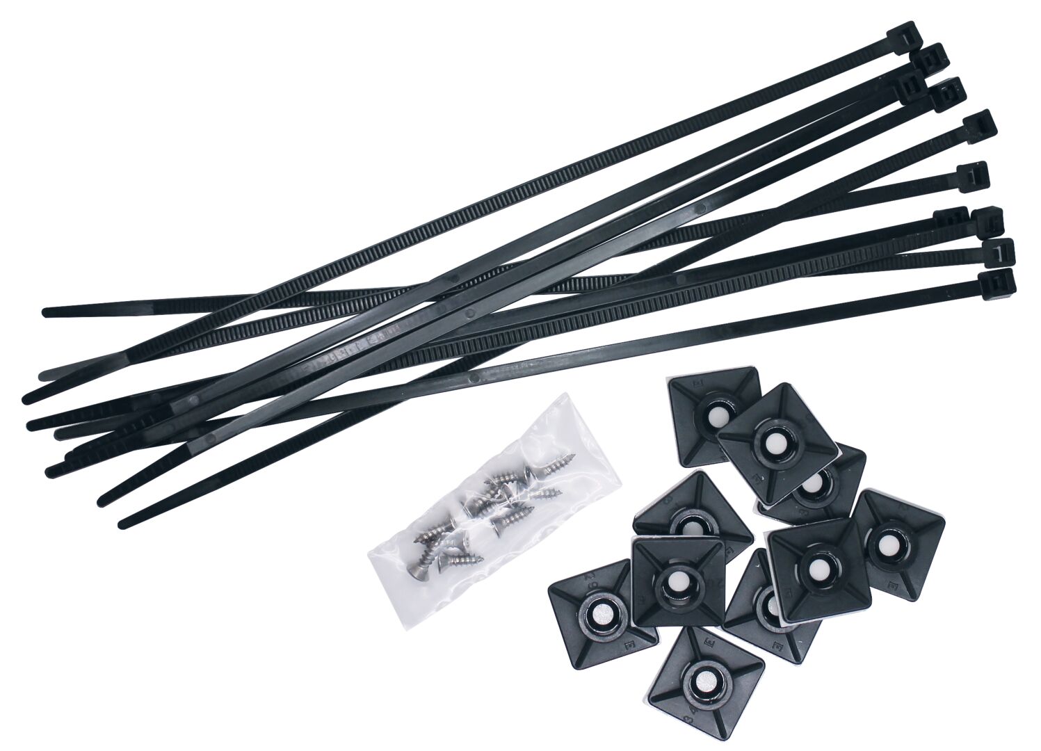 Nippusiteet: 3,6 x 200 mm<br />Kiinnikkeet: FXS 2,9 x 9,5 mm<br />Kaapelikiinnikkeet: 19 x 19 mm<br />Väri: Musta<br />Pakkaus: Sekapakkaukset