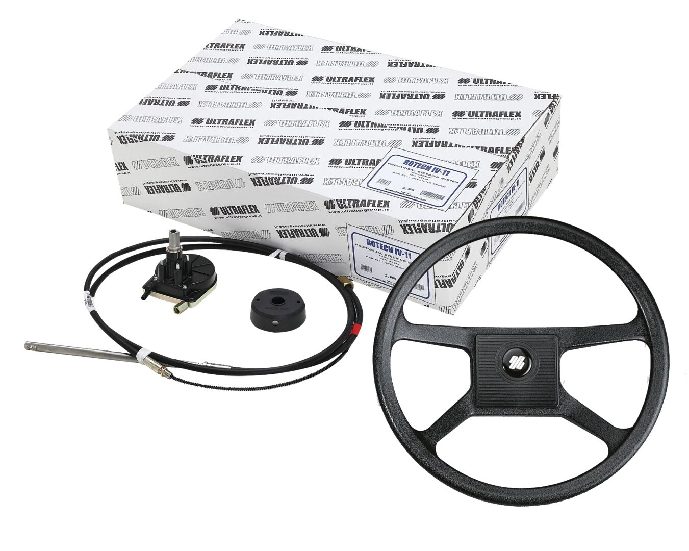 OHJAUSRUMPU T67 | 9513025130<br /><br />Iskunkestävästä muovista valmistettu ohjauspesä ja painevaluna valmistettu ohjausratas varmistavat tarkan ja varman ohjattavuuden. Notkea monisäikeinen kaapeli helpottaa asennusta. Soveltuu 2-tahti perämoottoreille alle 55 hv ja pienille uppoumarunkoveneille. <br /><br />? kaapelin pienin taivutussäde 200 mm<br />? ohjauspyörän kierto 2,5 kierrosta<br />? liike 230 mm<br />? työntövoima 120 kg, 1200 N, 40 kW asti <br />? ohjauspyörän halkaisija max 380 mm <br />? EN 29775 Safety standards, Norske Veritaksen hyväksymä T-67 ohjauspesä (musta)<br /><br />OHJAUSKAAPELI M58 | 9513025139<br /><br />Notkea, monisäikeinen ohjauskaapeli, jonka pienin taivutussäde on 200 mm. Kuoren Ø 15 mm, sisävaijeri Ø 5 mm, kierrevaijerin päältä Ø 7,5 mm. pituus 2,7 m.<br /><br />OHJAUSPYÖRÄ V32 | 9513024047<br /><br />Thermoplast-muovia, musta, halkaisija 340 mm.