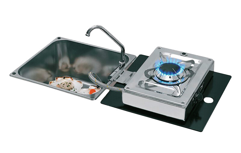 Ruostumattomasta teräksestä valmistettu pesuallas kylmävesihanalla. Kanteen integroitu kaasuliesi. Saranoitu kansi karkaistua lasia.