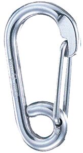 316L luokan ruostumaton teräskarbiinikoukku kiinnityssovelluksiin, symmetrinen muotoilu, varustettu silmukalla punoksen tai jatkeen kiinnittämiseen. Luokan 316L ruostumaton teräs.