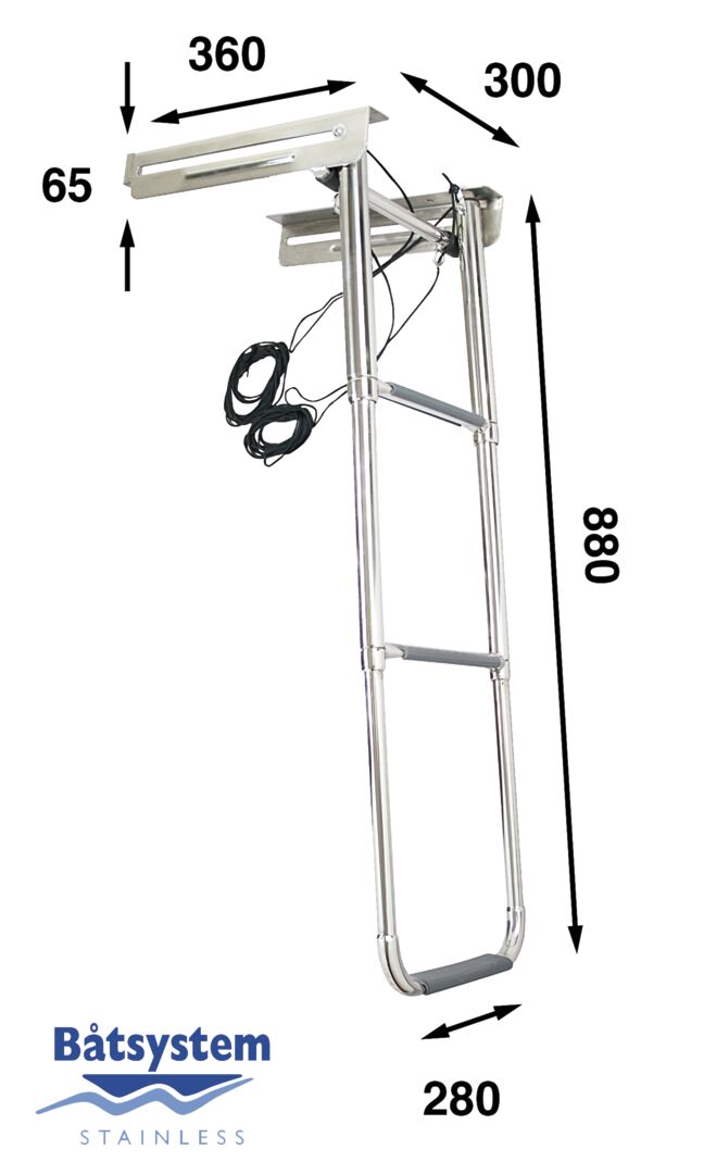 Kannelta naruilla ohjattavissa oleva keulatasoihin asennettava kasetti tikkaat. Alin, alas laskeutuva askelma on pyöristetty, joten se seuraa keulatason pyöreätä linjaa.
