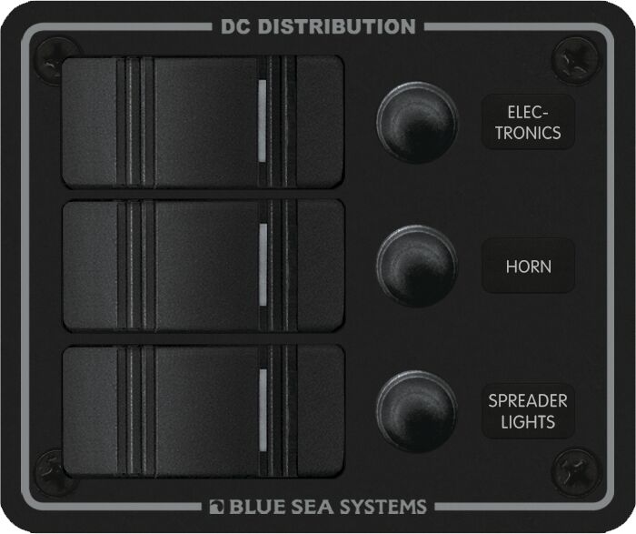 TEKNISET TIEDOT:<br />Vedenkesto: Vedenkestävä<br />Kytkimien määrä: 3<br />Nimellisjännite: 12V DC | 24V DC<br />Paneelin kumulatiivinen virrankesto: 45A<br />Kytkimen virrankesto: 20A @ 12V DC | 15A @ 24V DC<br />Korkeus: 95.25 mm<br />Leveys: 114.3 mm<br />Syvyys: 82.55 mm<br />Paino: 0.43 kg