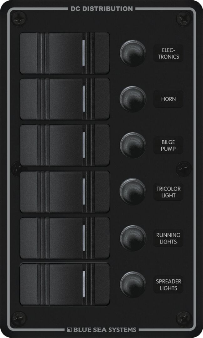 TEKNISET TIEDOT:<br />Vedenkesto: Vedenkestävä<br />Kytkimien määrä: 6<br />Nimellisjännite: 12V DC | 24V DC<br />Paneelin kumulatiivinen virrankesto: 45A<br />Kytkimen virrankesto: 20A @ 12V DC | 15A @ 24V DC<br />Korkeus: 190,5 mm<br />Leveys: 114,3 mm<br />Syvyys: 82,55 mm<br />Paino: 0.61 kg