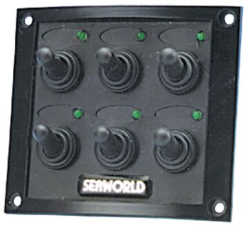 6:lla vesitiiviillä kytkimellä ja LED-merkkivalolla. Yksi kytkin äänitorvelle 15A. Riippusulakepesät lattasulakkeille, musta. 95 x 108 mm.