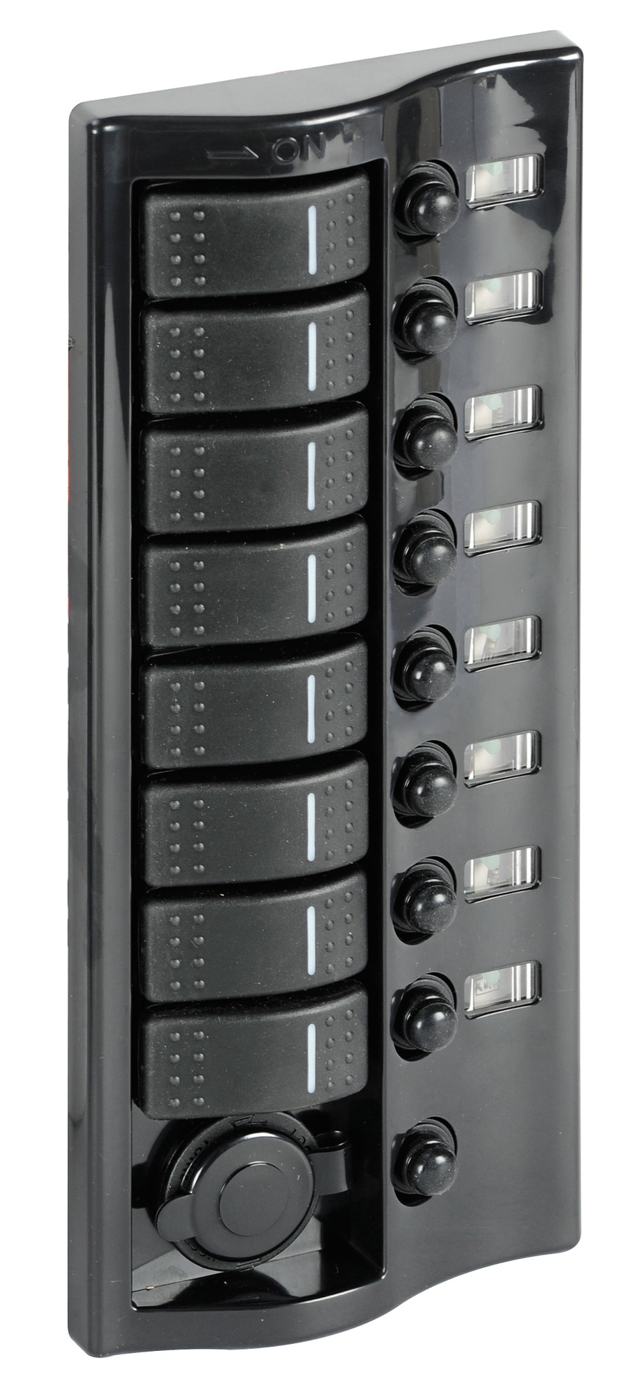 M14-196-01 kytkimet Automaattiset sulakkeet (resetoitavat) Väri: Musta Sulakkeet: 2kpl 5A / 5kpl 5A / 2kpl 15A Mitat: 280x115mm Vesitiiviit kytkimet (kpl): 8 + 12V
