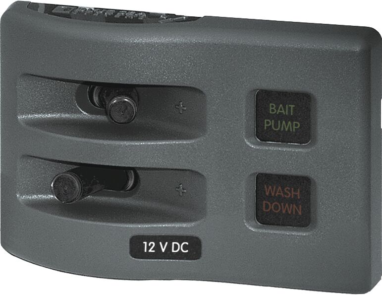 TEKNISET TIEDOT:<br />Säänkestävyys: Vesitiivis<br />Sulakkeiden määrä: 2<br />Nimellisjännite: 12V DC<br />Suojaus: Sulakkeet<br />Maksimi virta: 15A @ 12V DC (per virtapiiri)<br />Paneelin kumulatiivinen virrankesto: 30A<br />Taustavalo nimikeaukoissa: Kaksivärinen LED<br />Taustavalon virrankulutus: 10mA / päällä oleva virtapiiri<br />Taustavalon jännite: 12V DC<br />Materiaali: Vahvistettu polykarbonaatti<br />Korkeus: 66.04 mm<br />Leveys: 98.55 mm<br />Syvyys: 63.5 mm<br />Paino: 0.24 kg