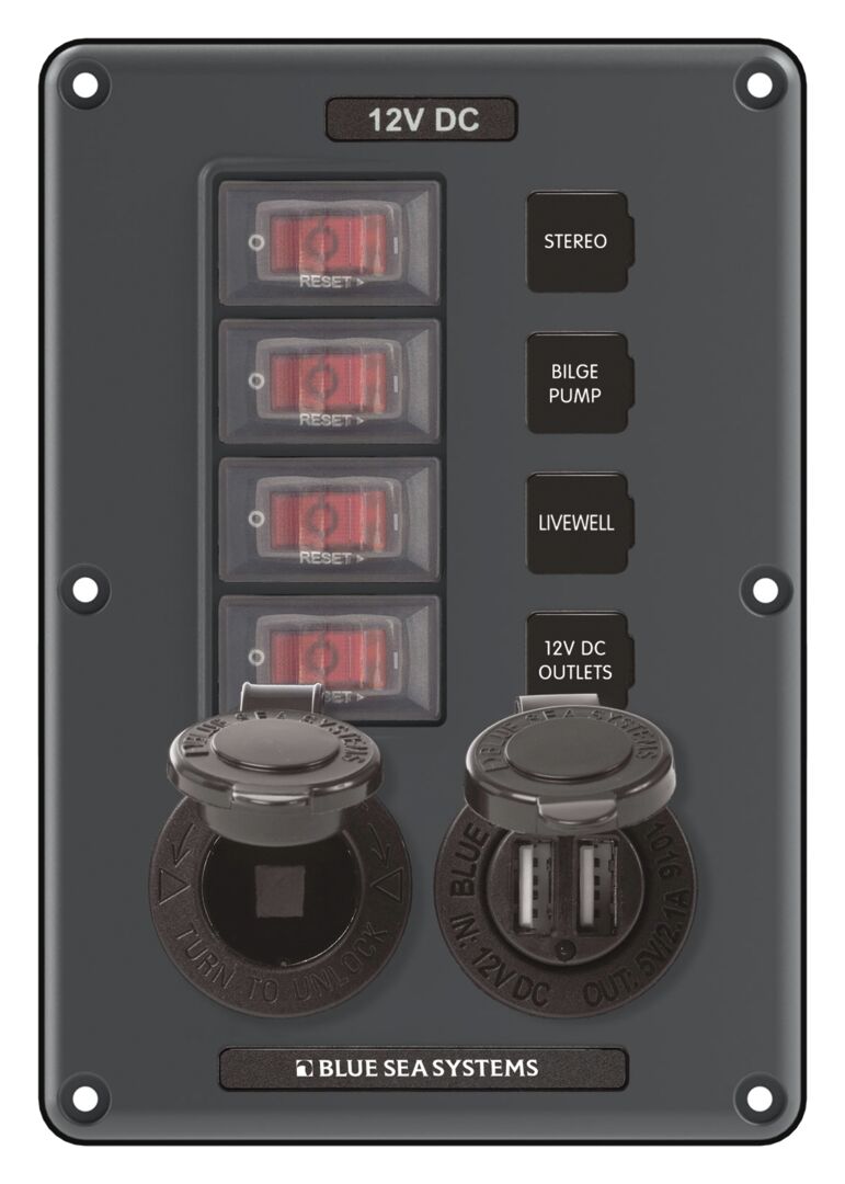 Ulkotiloihin sopiva vedenpitävä katkaisijapaneeli neljällä katkaisimella. Silikonikalvolla suojatut valaistut automaattisulakkeet 15A-katkaisintoiminnalla. Paneelin runko on tummanharmaata vahvaa polykarbonaattia ja se on UV- suojattu. Paneelin maksimikuormitus 45A. Paneelissa lisänä kaksi USB-porttia ja tupakansytytin.
