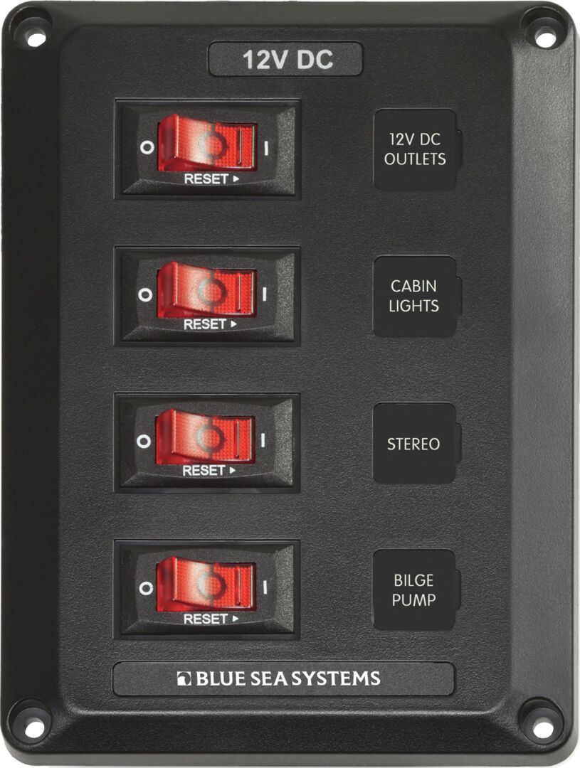 KESTÄVÄ: Valettu kehys kestää UV-säteilyä ja suolasumua HELPPO ASENTAA: Matala profiili tekee asennuksen ahtaisiin tiloihin helpoksi YKSINKERTAINEN KYTKEÄ: Virtakatkaisijoissa pikaliittimet KÄTEVÄ KOKONAISUUS: Punaiset 'ON'-merkkivalot takaavat tulkintavirheettömyyden huonoissakin valaisuolosuhteissa • 4 Carling Technologies™ -yhtiön 15A:n virtakatkaisijaa • ON-merkkivalot • Polykarbonaatti/ABS paneelipinta, UV-säteilyä kestävä, paloa hillitevä, ei altis korroosiolle • Pikaliittimillä varustettu KISKO poistaa johtonippujen tarpeen ja sekavat kytkennät • Kahden johtimen liitäntä virransyöttöön, #10 rengasliittimet. Liittimet ruuvataan väyläkiskoihin liitäntöjen varmistamiseksi • Mukana 15 kpl nimilappuja, helppo vaihtaa. Lisää erilaisia nimilappuja eri toiminnoille on saatavissa Blue Sea Systemsin valikoimasta • Mukana RST kiinnitysruuvit #6 x 5/8?