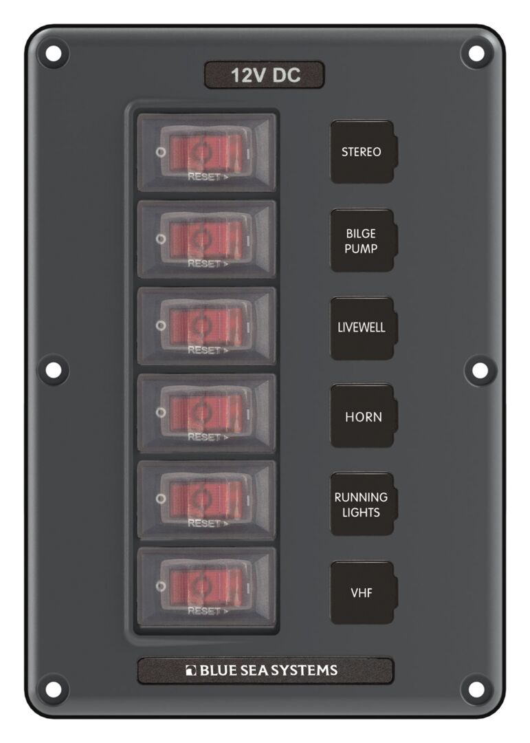 Ulkotiloihin sopiva vedenpitävä katkaisijapaneeli kuudella katkaisimella. Silikonikalvolla suojatut valaistut automaattisulakkeet 15A-katkaisintoiminnalla. Paneelin runko on tummanharmaata vahvaa polykarbonaattia ja se on UV- suojattu. Paneelin maksimikuormitus 45A.