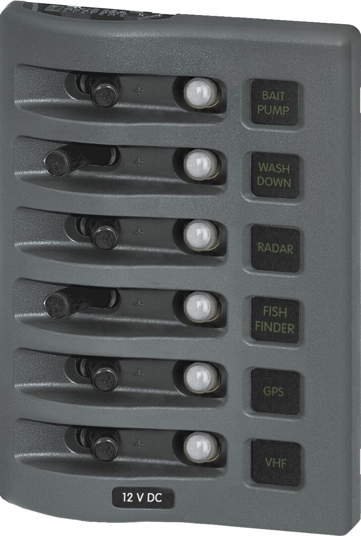 WEATHERDECK® 12V DC VESITIIVIS KATKAISINPANEELI - HARMAA 6-ASENTOINEN • Suojausluokka IP67, sietää upotuksen veteen 30 minuutin ajaksi • Suunniteltu ylä- ja avo-ohjaamosovelluksiin • Erillinen nimikeaukkojen valaistus, kytkentä- ja himmennysmahdollisuus • Yhteensopiva kaikkien Blue Sea Systemsin digitaalisten himmentimien kanssa • Saatavissa myös 8- ja 4-katkaisijan malleina • Kukin paneeli on mahdollista asentaa neljään eri asentoon • Vihreä LED-merkkivalo helpottaa nimikkeiden lukemista hämärässä. Kaikki nimikeaukot valaistuvat kun paneeliin kytketään virta riippumatta yksittäisten katkaisijoiden asennosta.