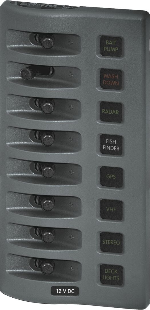 TEKNISET TIEDOT:<br />Säänkestävyys: Vesitiivis<br />Sulakkeiden määrä: 8<br />Nimellisjännite: 12V DC<br />Suojaus: Sulakkeet<br />Maksimi virta: 15A @ 12V DC (per virtapiiri)<br />Paneelin kumulatiivinen virrankesto: 100A<br />Taustavalo nimikeaukoissa: Kaksivärinen LED<br />Taustavalon virrankulutus: 10mA / päällä oleva virtapiiri<br />Taustavalon jännite: 12V DC<br />Materiaali: Vahvistettu polykarbonaatti<br />Korkeus: 195.58 mm<br />Leveys: 98.55 mm<br />Syvyys: 63.5 mm<br />Paino: 0.7 kg