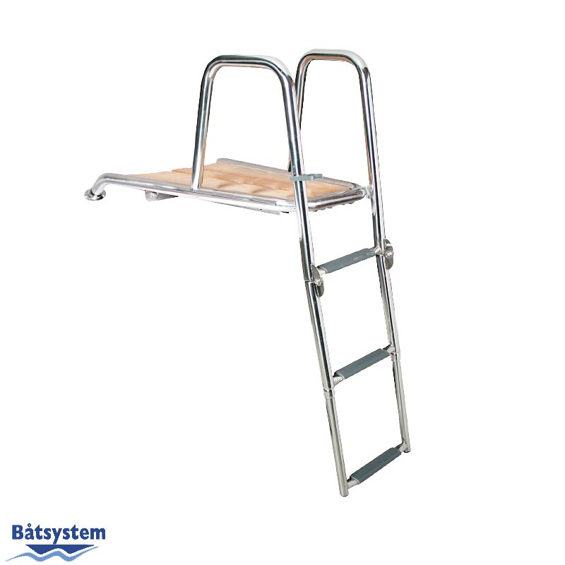Keulataso tukevilla kolme-askelmaisilla kiinteillä tikkailla. Kannen päälle kiinnitettävä moottorivenemalli. Pituus 700 mm, leveys 480 mm, portaiden kokonaiskorkeus kahvasta alimpaan askelmaan 1120 mm.<br />