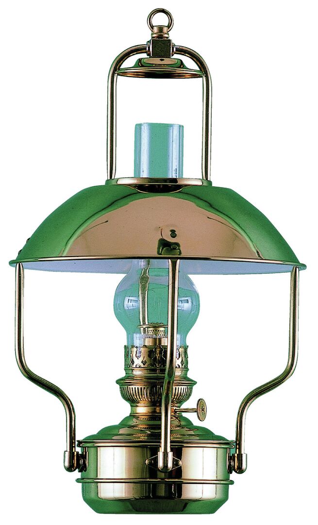 Korkealuokkainen valopetroli-purjehduslamppu. Kiillotettua ja lakattua messinkiä, sisäpuolelta valkoinen suojakupu, lasin koko 2' x 170 mm, lampun lasi 15', paloaika noin 40 tuntia, DHR.
