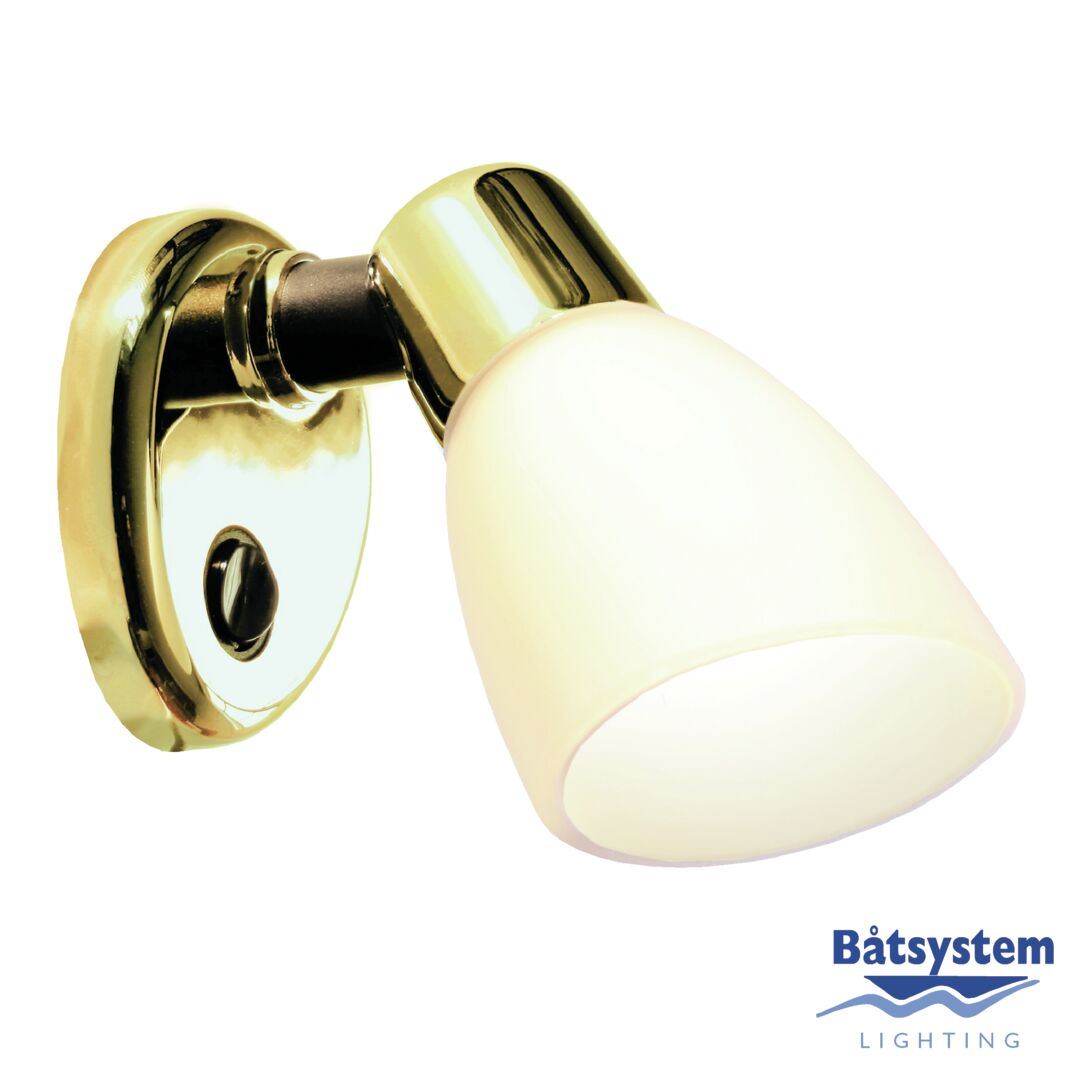 Katkaisimella varustettu valaisin valkoisella lasisella varjostimella, runko messinkiä. 8-30 V. LED-polttimo 94G4V.