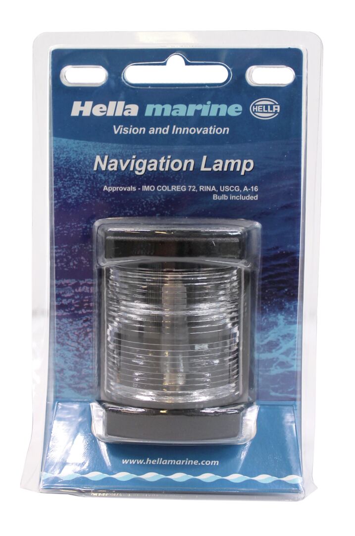 Hella Marine kulkuvalo, masto. Valkoinen valo, musta runko. Veneisiin alle 12m. 12V polttimo, 10W.