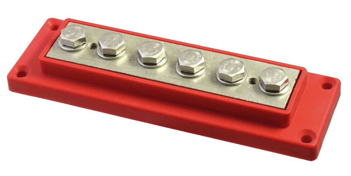 Kytkentäkisko suurille virroille, kisko on tinattua messinkiä ja se on eristetty nailonjalustalla. Kiinnityspultit ovat ruostumatonta terästä. 6 x 50 mm2, punainen. Pulttikoko M8