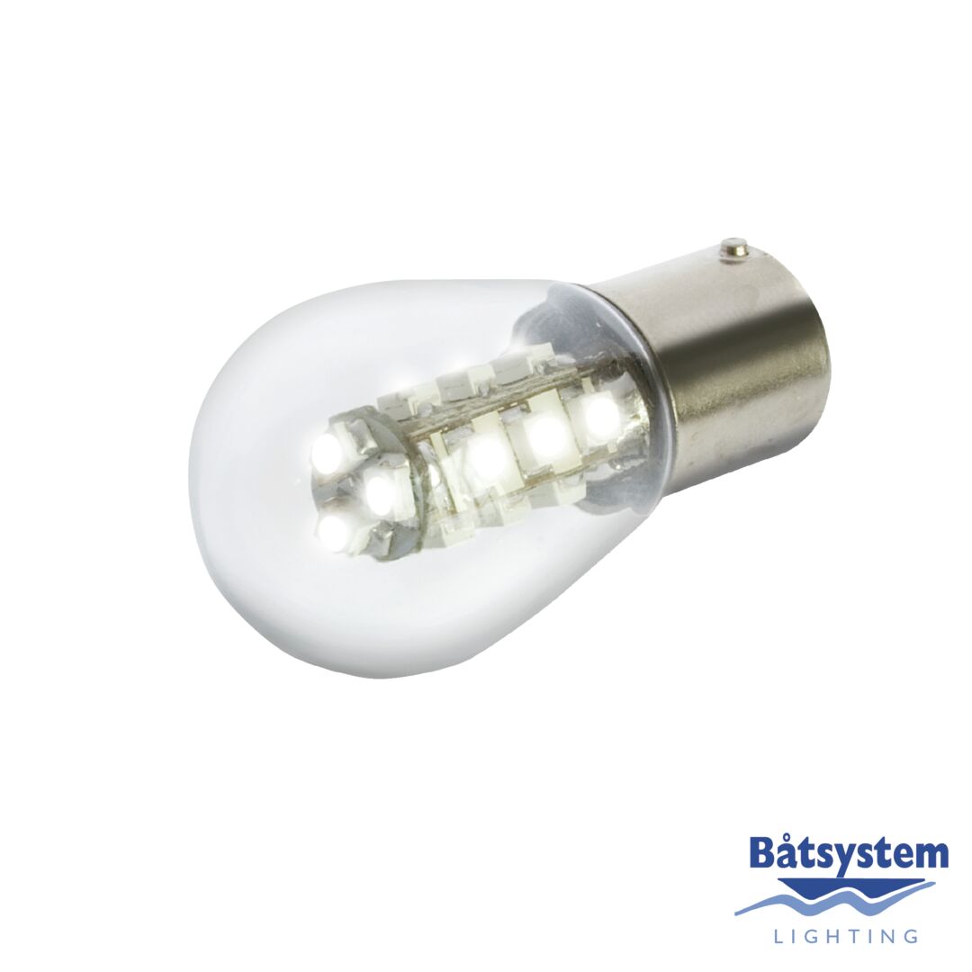 15 SMD LED-korvauspoltin bajonettikantaisiin valaisimiin. Värisävy 3200K. 10 - 30 V, 0,7 W, BA15D-kanta.
