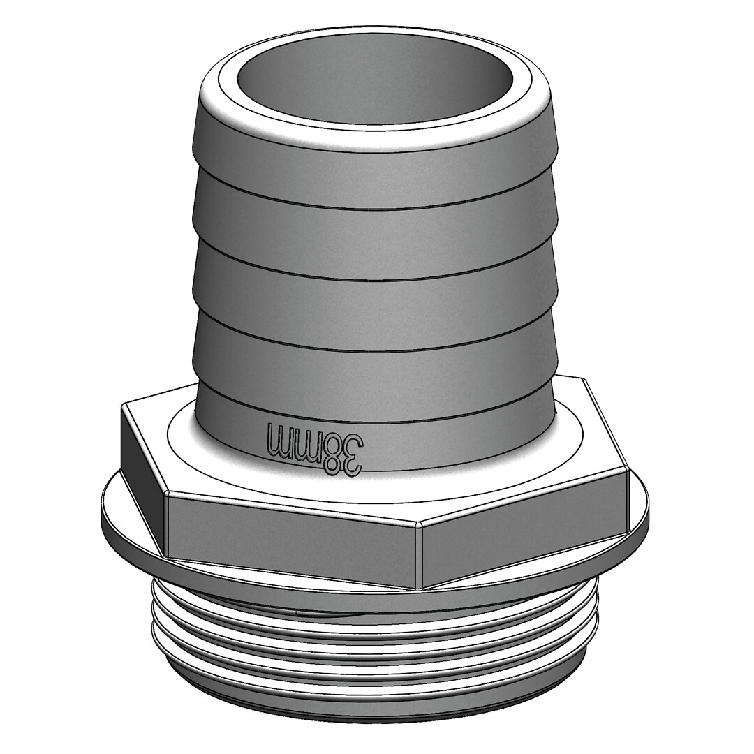 Suora letkuliitin, valkoista komposiittia, 1 1/2' kierteellä, 38 mm letkulle.