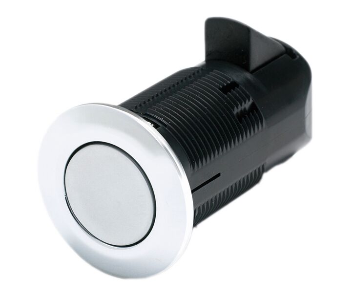 Lokerolukko ”Point” pyöreällä kehyksellä. Helppo asentaa, kiinnitys kiristysmutterilla. Yksinkertaisen elegantissa lukossa on sisäänpainettava metallinen vetonuppi, joka ponnahtaa ylös painalluksella. Salpa pysyy tukevasti paikoillaan riippumatta siitä, onko nuppi painettuna sisään vai ulos.