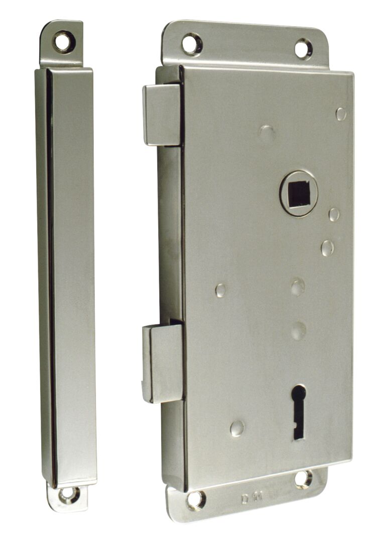Oven lukko kromattua messinkiä. Pinta-asennus, sisältää kolme avainta. Neliö 9 mm.