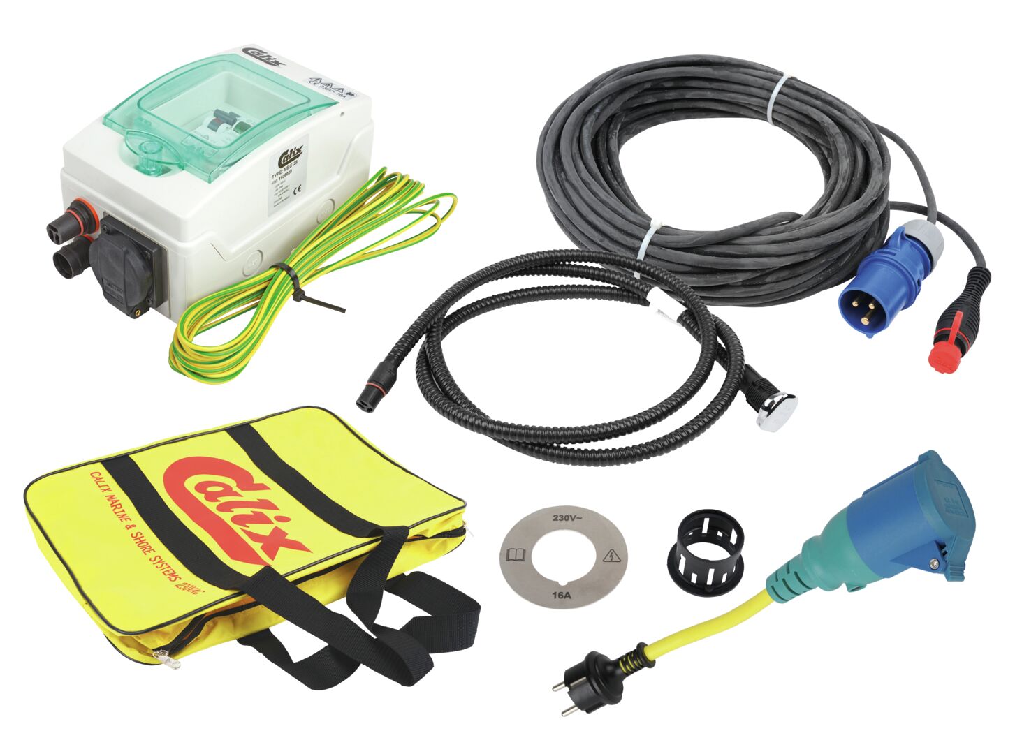 • maasähkökeskus Schuko-pistorasialla<br />• maasähköpistorasia Calix mini, 2 m kaapelilla<br />• minipistorasian asennussarja<br />• 10 m maavirtajohto CEE-/Calix-miniliitin<br />• maavirtajohdon säilytyskassi<br />• sovitinjohto Schuko/CEE