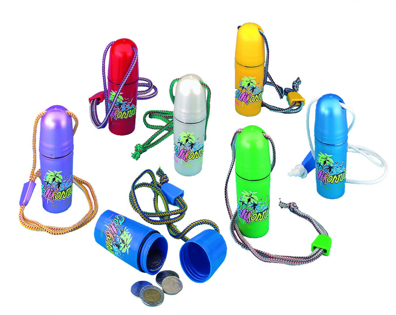 Kaulassa roikutettava, vesitiivis pikkutavaran säilytyspaikka, värillistä muovia, tiivisterenkaalla.