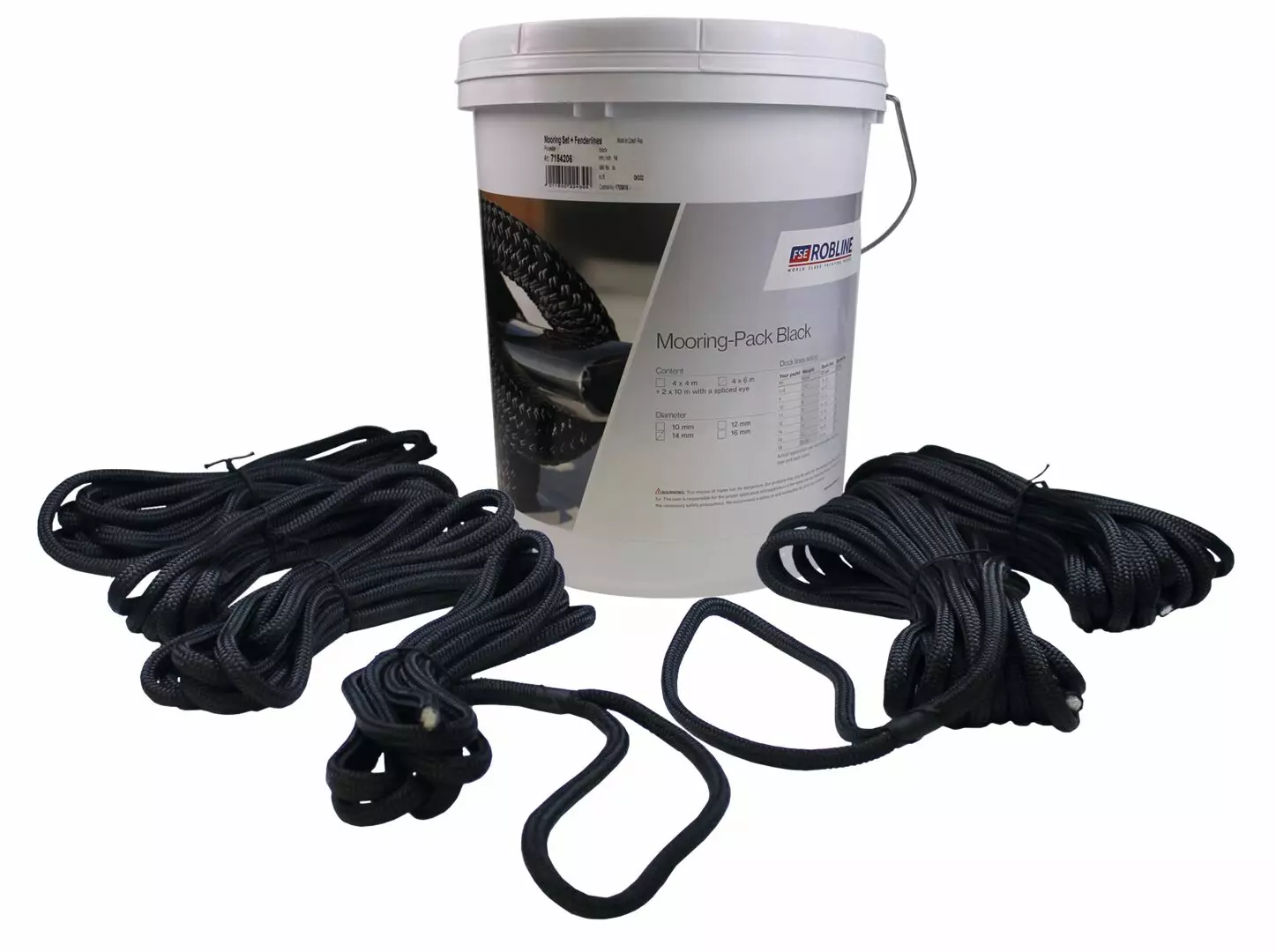 Kiinnitysköysisarja pakattuna ämpäriin. Kiinnitysköysisarja sisältää 4 kpl x 6m ja 2 kpl x 10 m mustaa punottua köyttä, jossa toinen pää pleissattu. Kevyt, tyylikäs, kulutusta ja UV-säteilyä kestävä kiinnitysköysi. Silmukka 350 mm. Köyden halkaisija 14 mm.