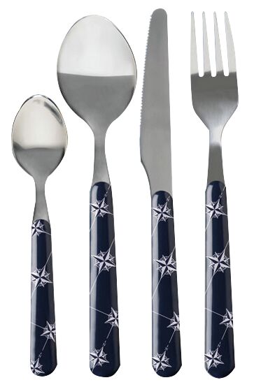 24-osainen NORTHWIND-ruokailuvälinesarja (6 henkilöä) on valmistettu ruostumattomasta teräksestä ja sen kompassiruusu-kuvio on painettu ABS-kahvalle. Aterimet 24 kpl/pkt: • 6 kpl kahvilusikka • 6 kpl ruokalusikka • 6 kpl veitsi • 6 kpl haarukka