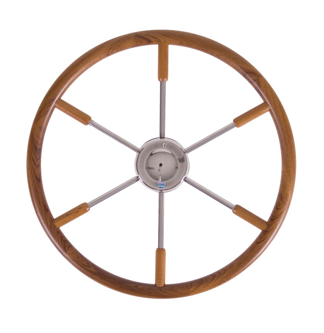 Pinnaruori ruostumatonta terästä. Ulkorengas ja kahvat tiikkiä, Ø 500 mm, 6 pinnaa.