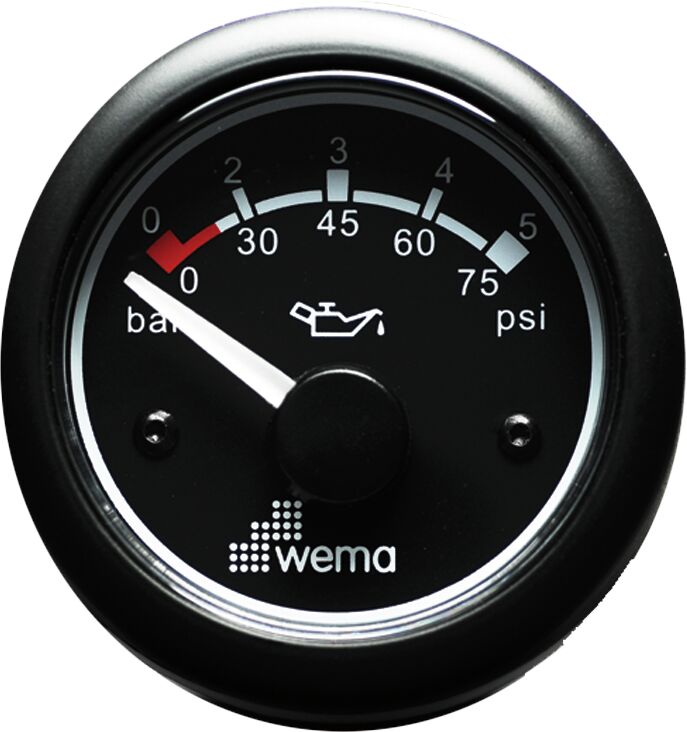 Öljypainemittari 5 kg. Asennus Ø 52 mm, asennussyvyys 62 mm, kokonais- Ø 62 mm. Vakiona punainen ja keltainen valaistus. Käyttöjännite 12/24V. Musta pohja / musta kehys.