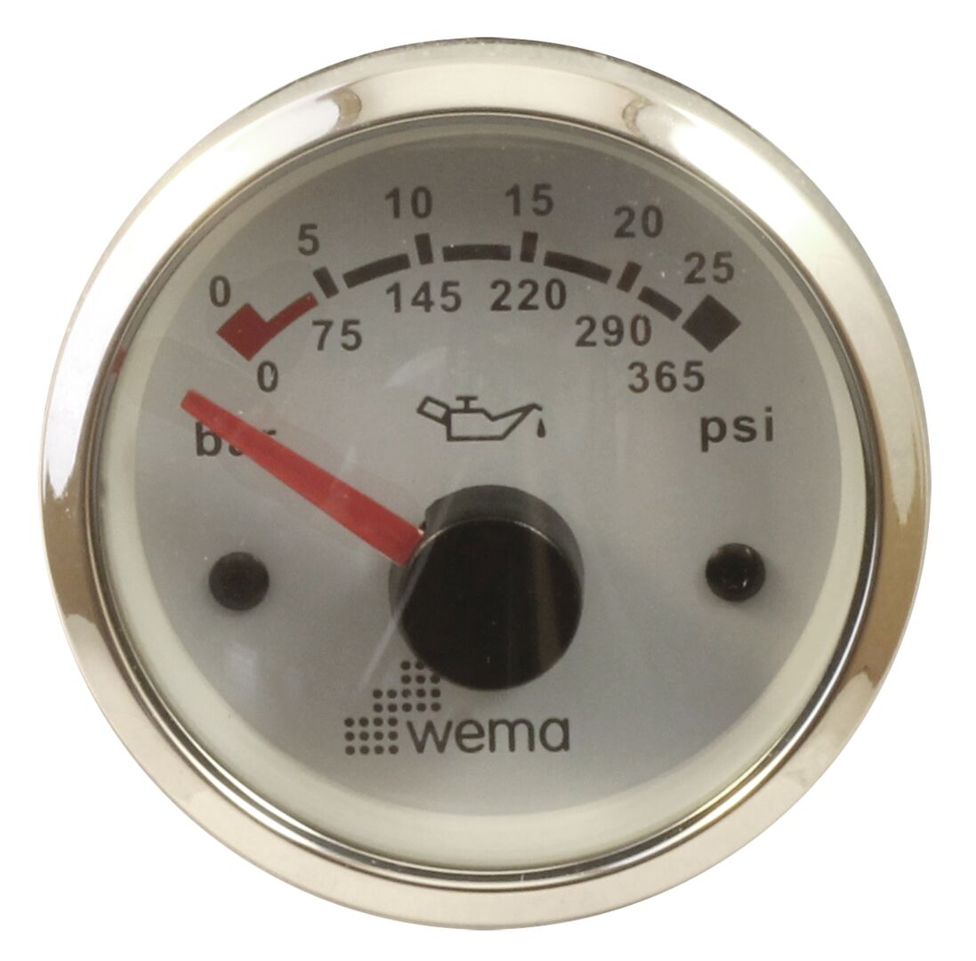 Painemittari, öljy-, vaihteisto-, ahto- ja vedenpaineen mittaamiseen. Sopii kaikkiin antureihin, joissa on ulostuloarvo 10 - 180 ?. Asennus-Ø 52 mm, asennussyvyys 62 mm, kokonais-Ø 62 mm. Vakiona on punainen tai keltainen valaistus. Käyttöjännite 12 V, 24 V -järjestelmissä on käytettävä mukana seuraavaa etuvastusta.